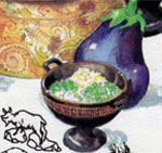 Brown aubergine and potatoes in oil, drain and set aside. In 2 tablespoons melted butter, saute onion and meat until brown.