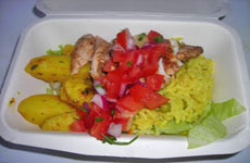Well Folks, after trials and errors and from listening to our customers, we seem to have arrived at our signature dish. It is Reggae Potatoes, Caribbean Rice and Jerk Chicken on a bed of Lettuce and topped with a Fruity Salsa, all for a fiver.
